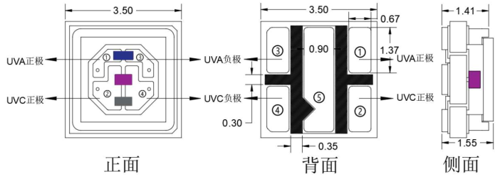 • As shown in the above figure, â‘  is the UVA positive electrode, â‘¡ is the UVC positive electrode, â‘¢ is the UVA negative electrode, and â‘£ is the UVC negative electrode; ⑤ It is a heat dissipation pad;