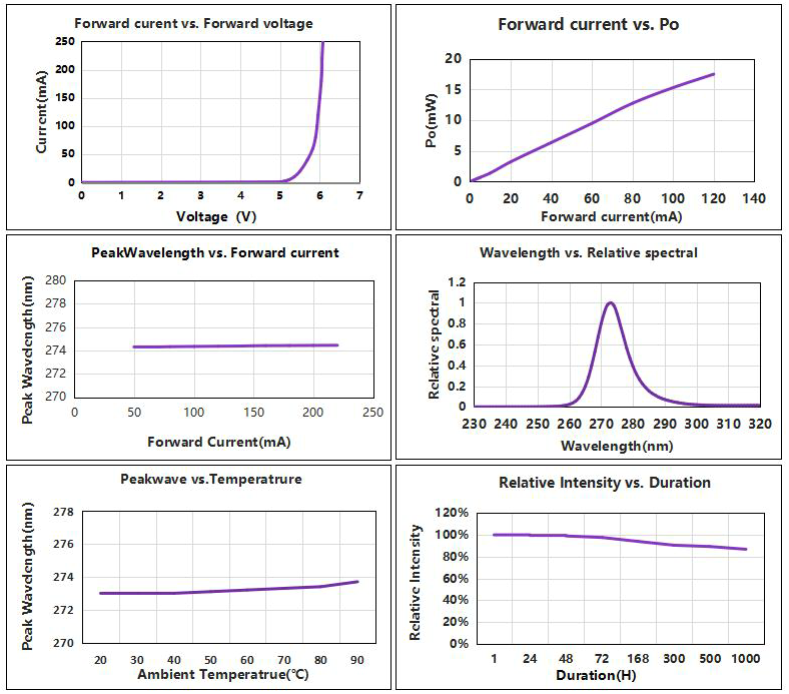 • A single device contains three different kinds of chips, which are UVA / UVC / zener diodes. The zener diode plays an ESD protection role on UVC led;