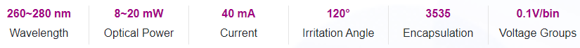 UVC photoelectric parameters and spec range (@ 40mA, Ta = 25 ℃, Rh = 30%)