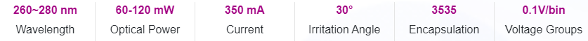 UVC photoelectric parameters and spec range (@ 350mA, Ta = 25 ℃, Rh = 30%)