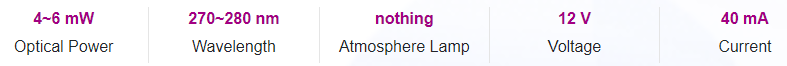 UVC photoelectric parameters and spec range (TA = 25 ℃, Rh = 30%)