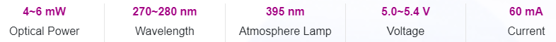 • Constant current drive: uva 20mA + UVC 40mA = 60mA, voltage 5.0-5.4v