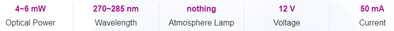 UVC photoelectric parameters and spec range (TA = 25 ℃, Rh = 30%)