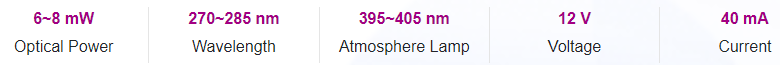 UVC photoelectric parameters and spec range (TA = 25 ℃, Rh = 30%)