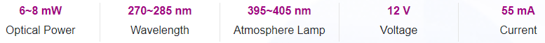 UVC photoelectric parameters and spec range (TA = 25 ℃, Rh = 30%)